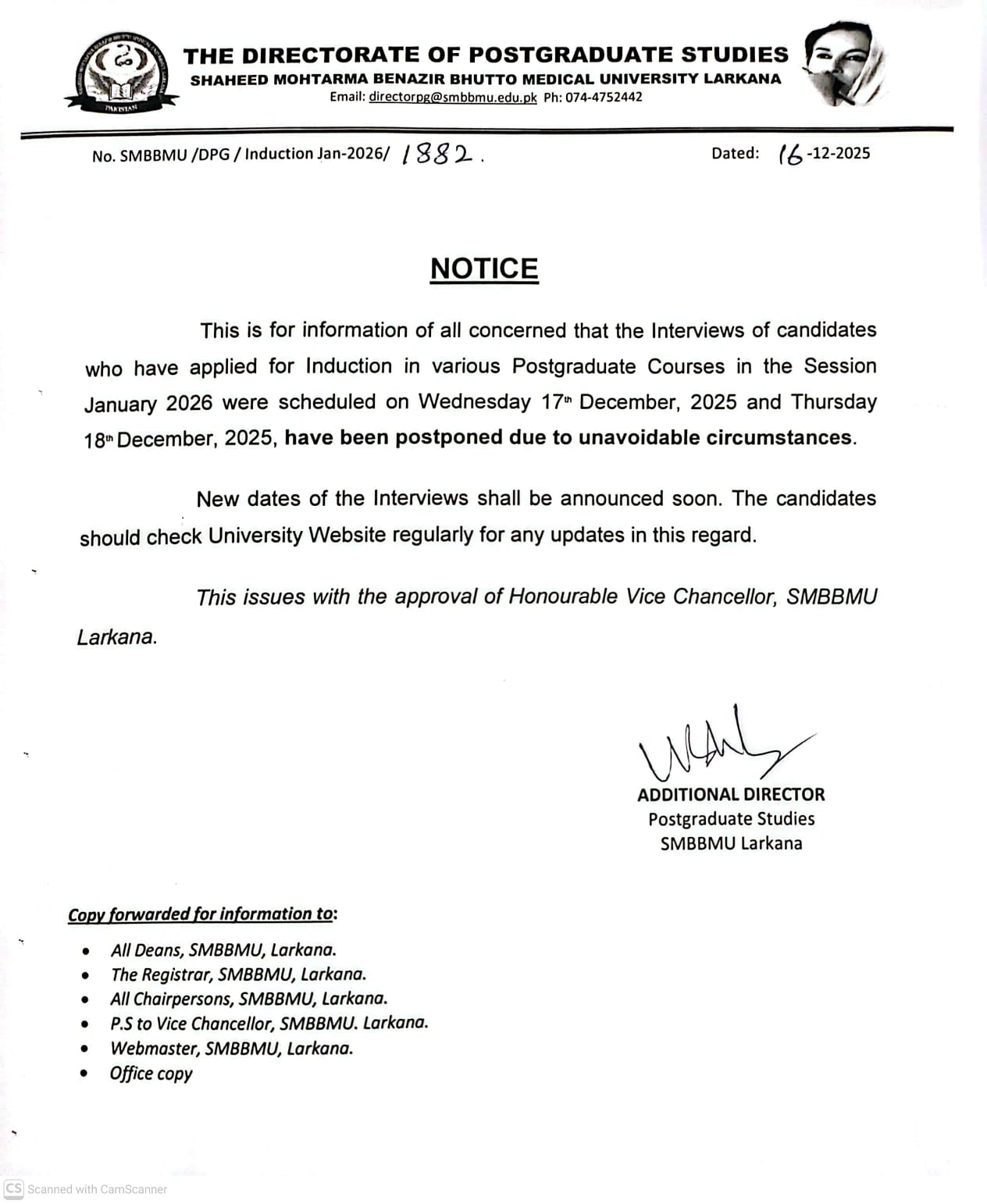 Interview Postponement Notice for PG Courses (January 2026 Session)