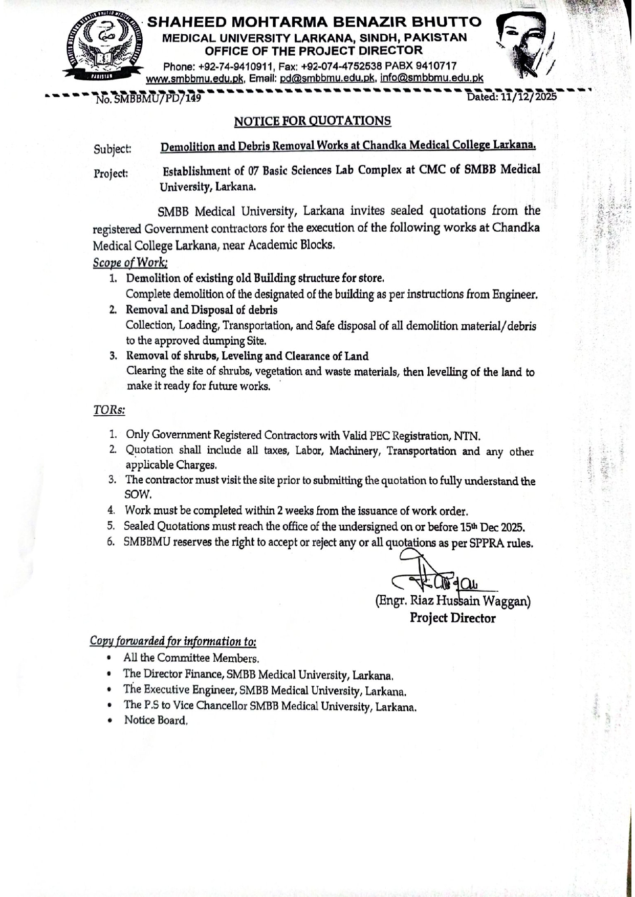 Notice for Quotations for Demolition and Debris Removal Works at Chandka Medical College Larkana.