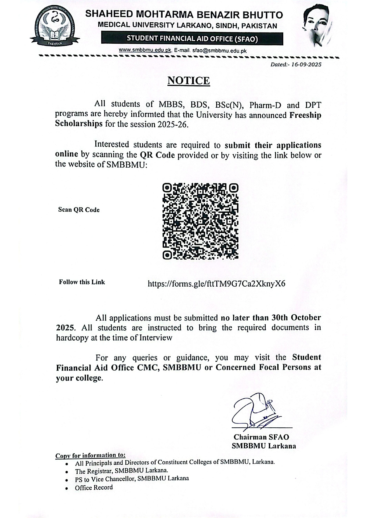 Notice for the students to apply for Freeship Scholarship 2025-26