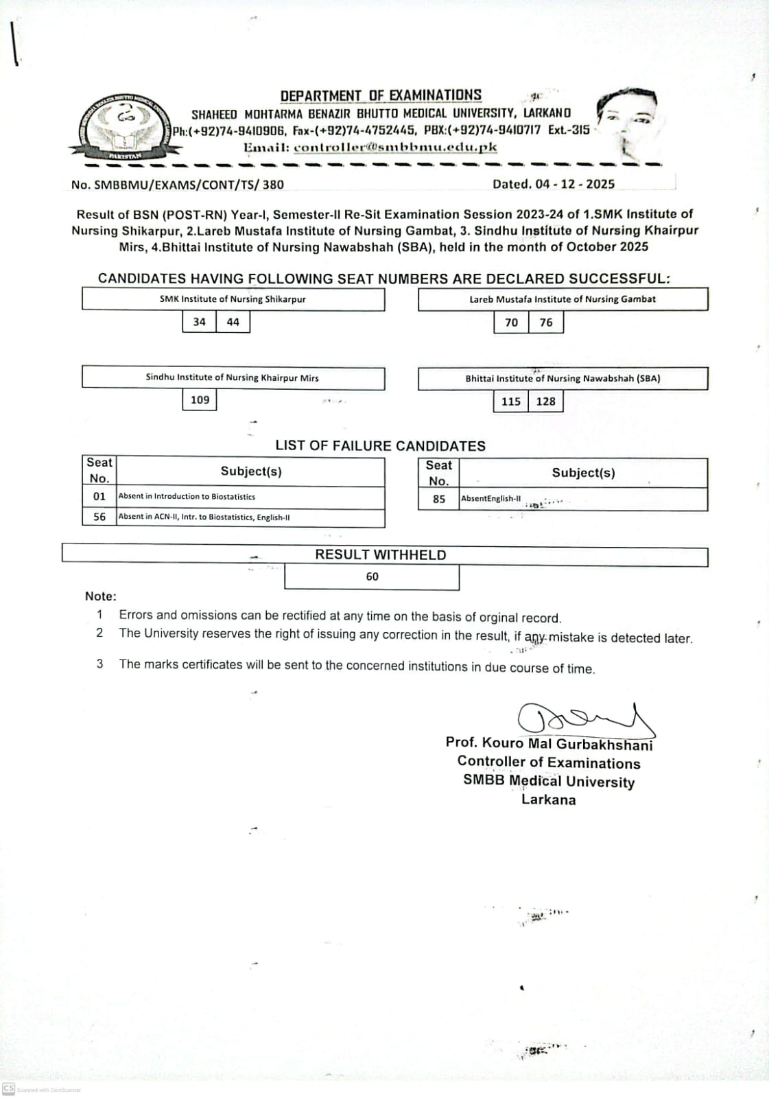 Result of BSN (POST-RN) Year-I, Semester-ll Re-Sit Examination Session 2023-24