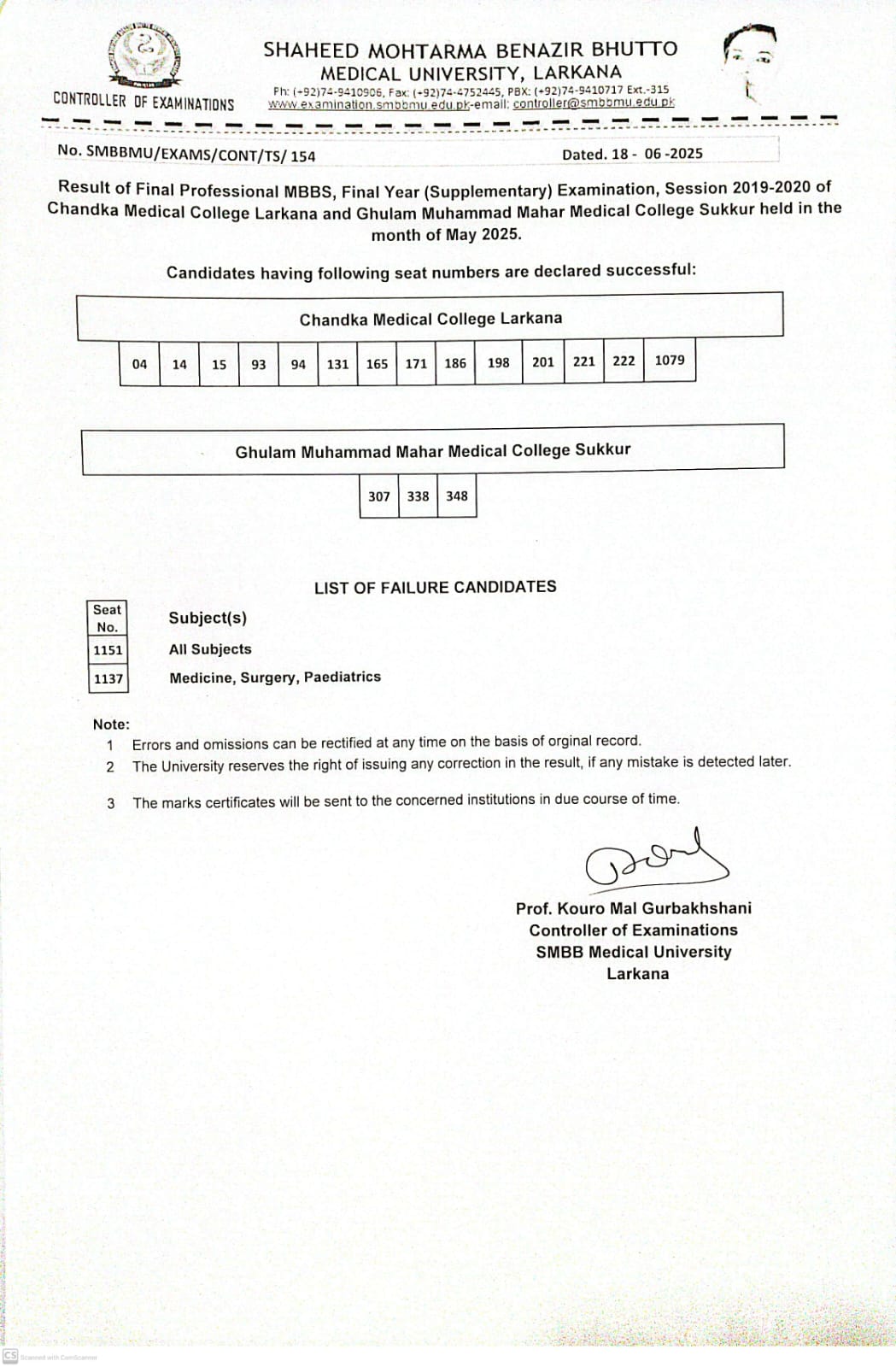 Result of Final Year MBBS Supplementary Examination for Session 2019-2020 held in the month of May 2025