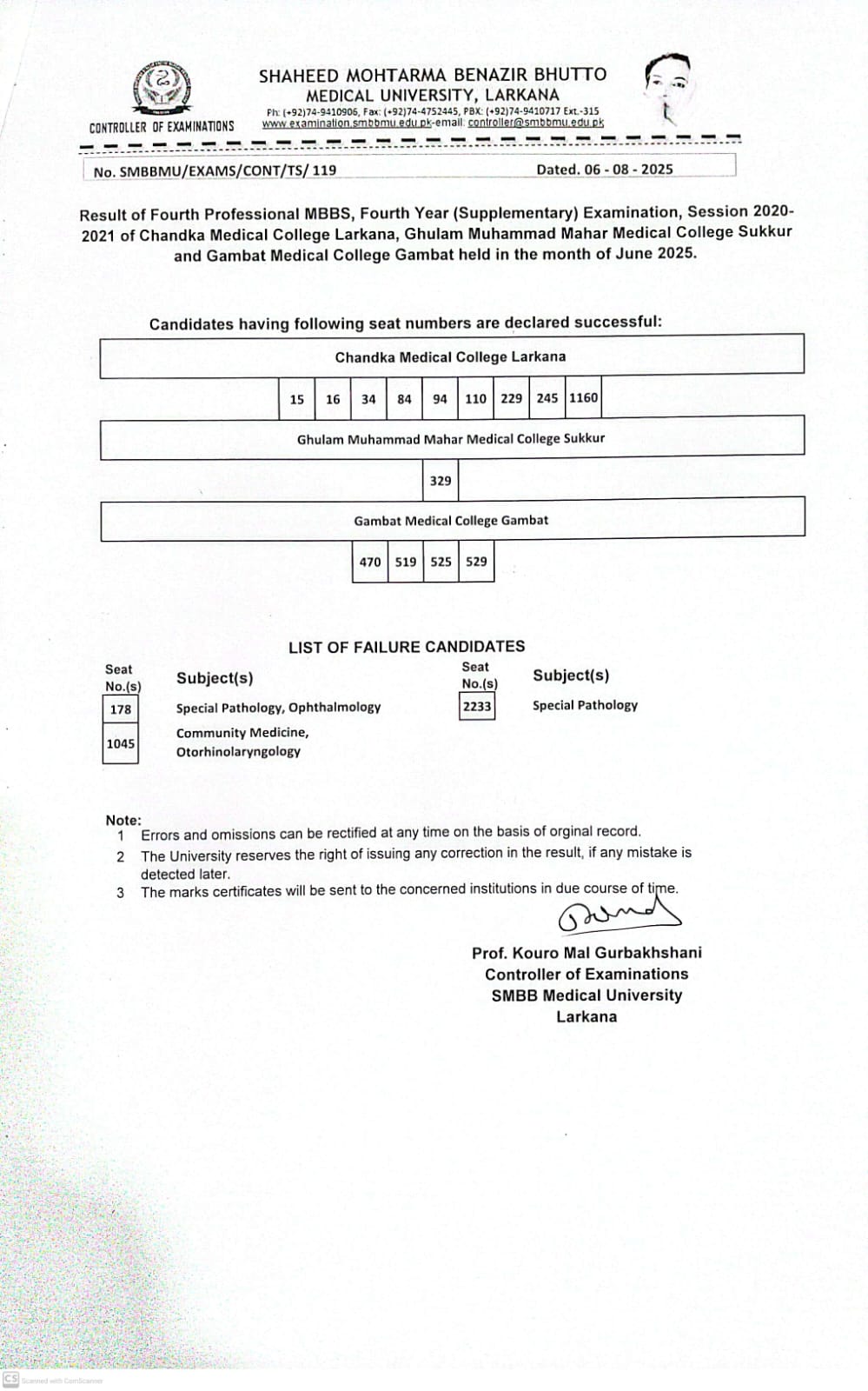 Result of Fourth Professional Examination (Supplementary) Session 2020-21