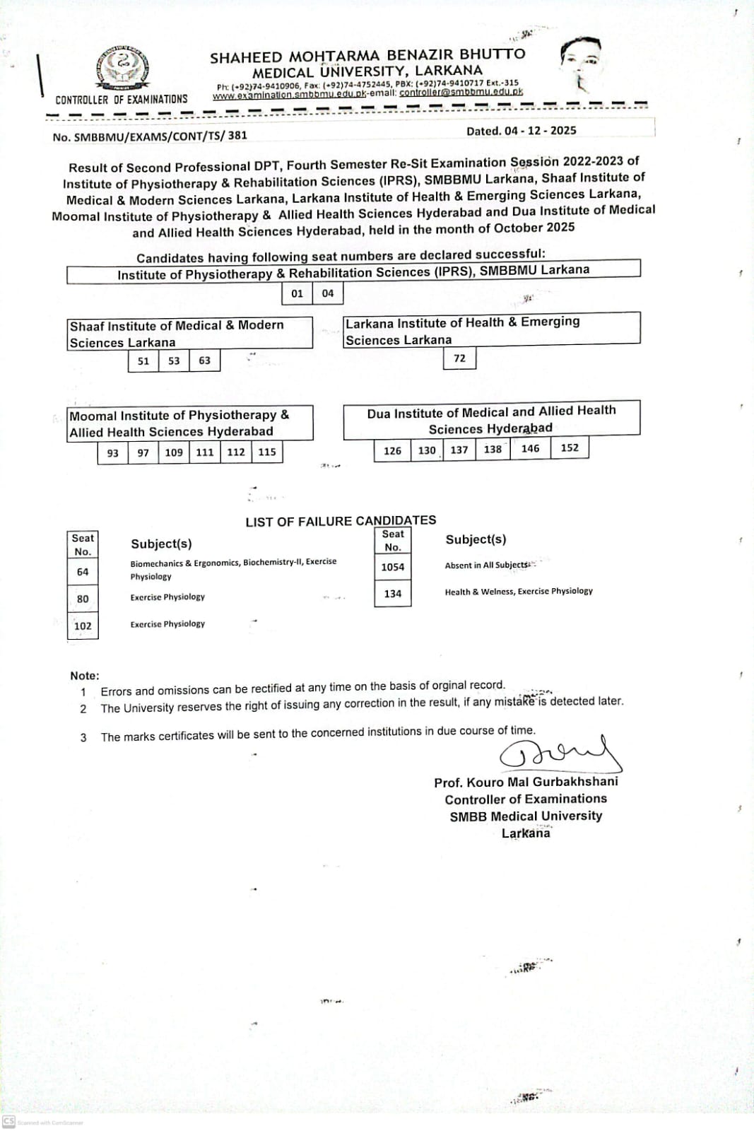 Result of Second Professional DPT, Fourth Semester Re-Sit Examination Session 2022-2023