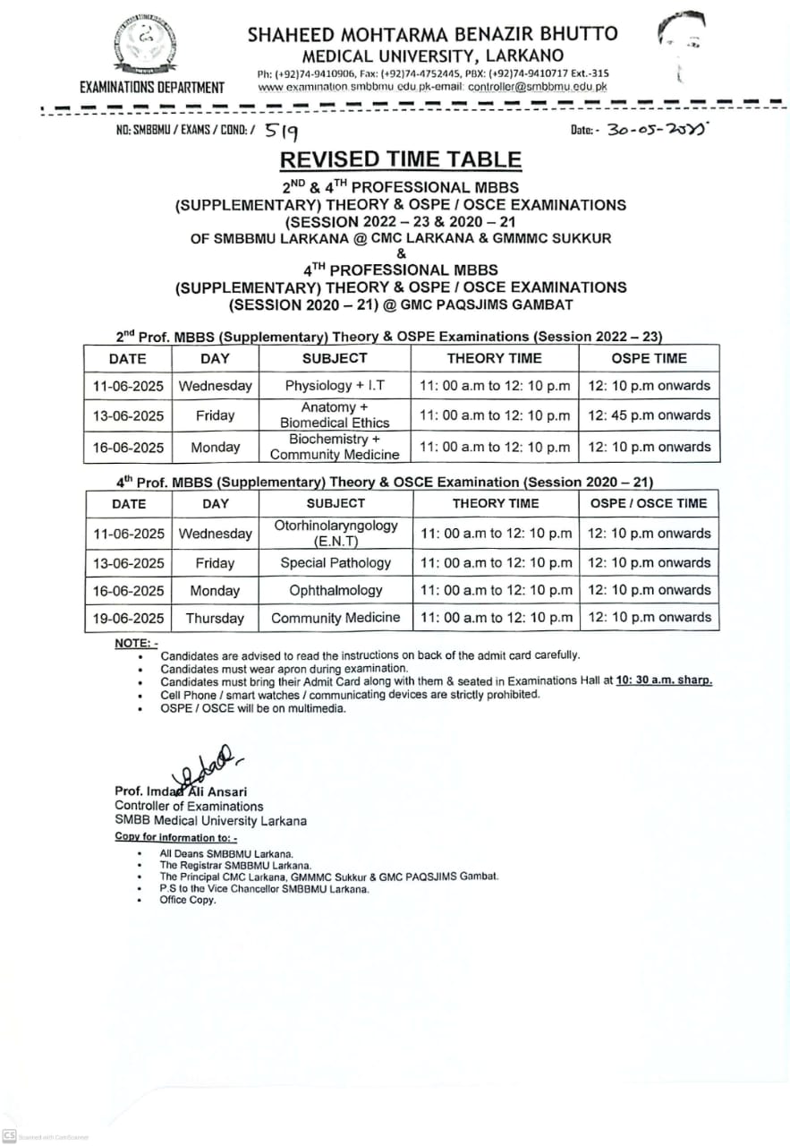 Revised Timetable of 2nd & 4th Professional MBBS (Supplementary) Examinations