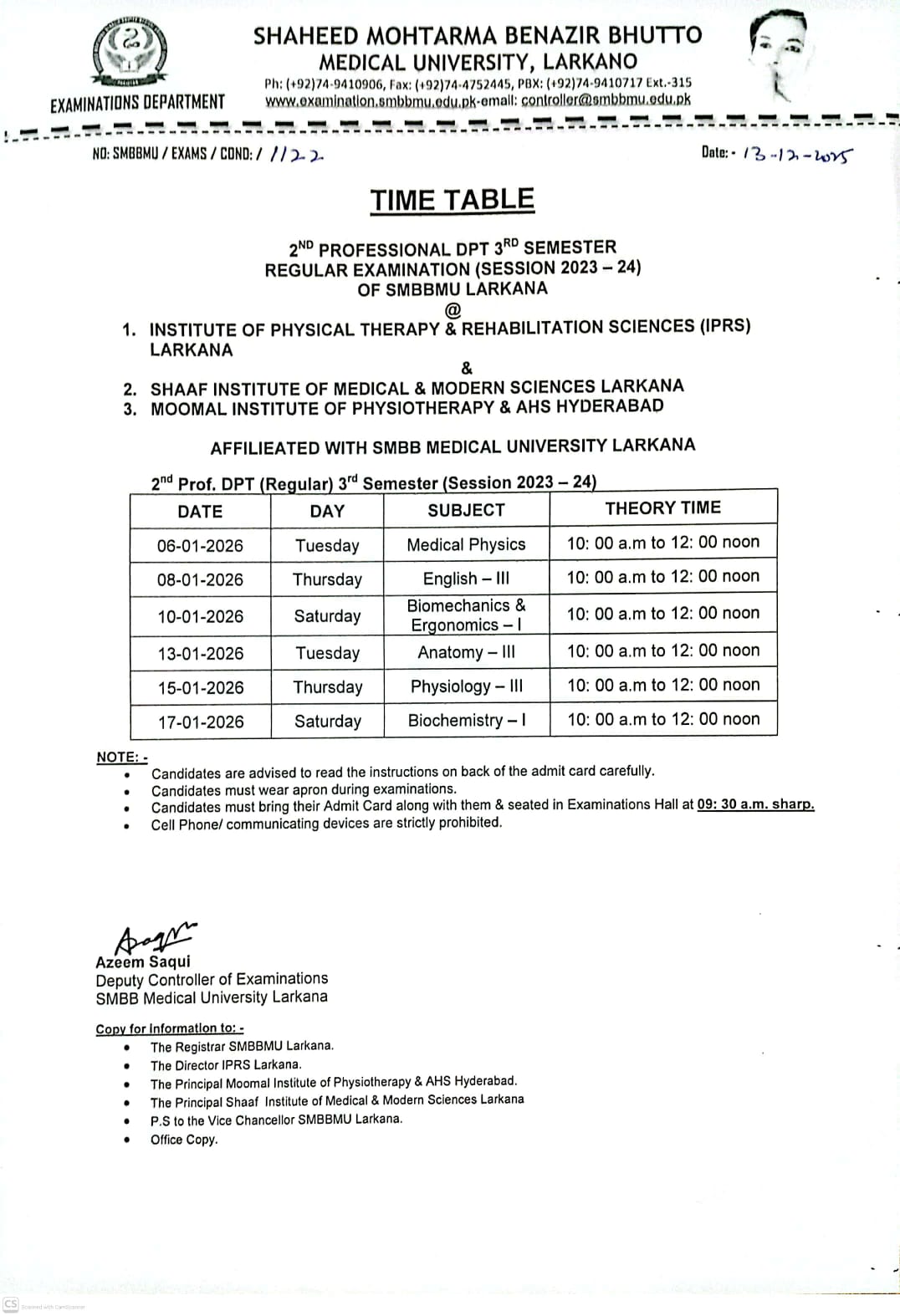 Time Table of 2nd Professional DPT 3rd Semester Regular Examination