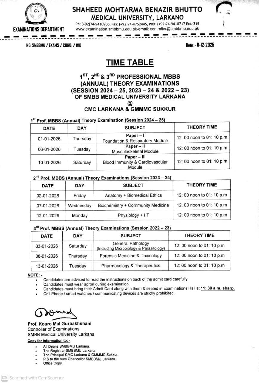 Timet Table of 1st, 2nd and 3rd Professional MBBS Examination