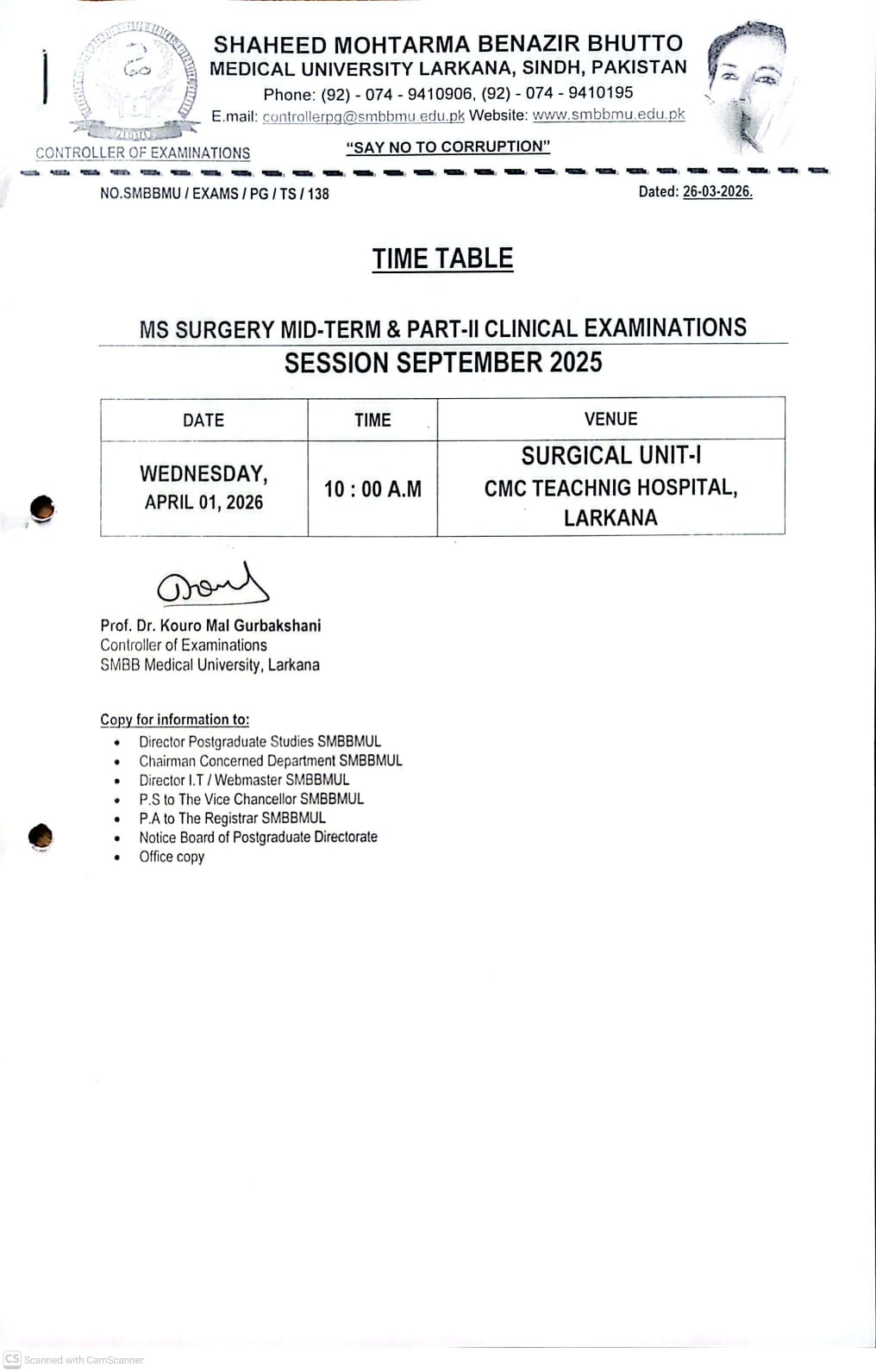Timetable of MS Surgery Mid-Term & Part-II Clinical Examinations Session September 2025