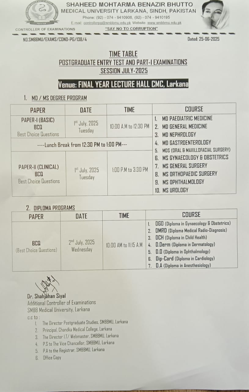 Timetable of Postgraduate Entry Test & Part-I Examination Session July - 2025
