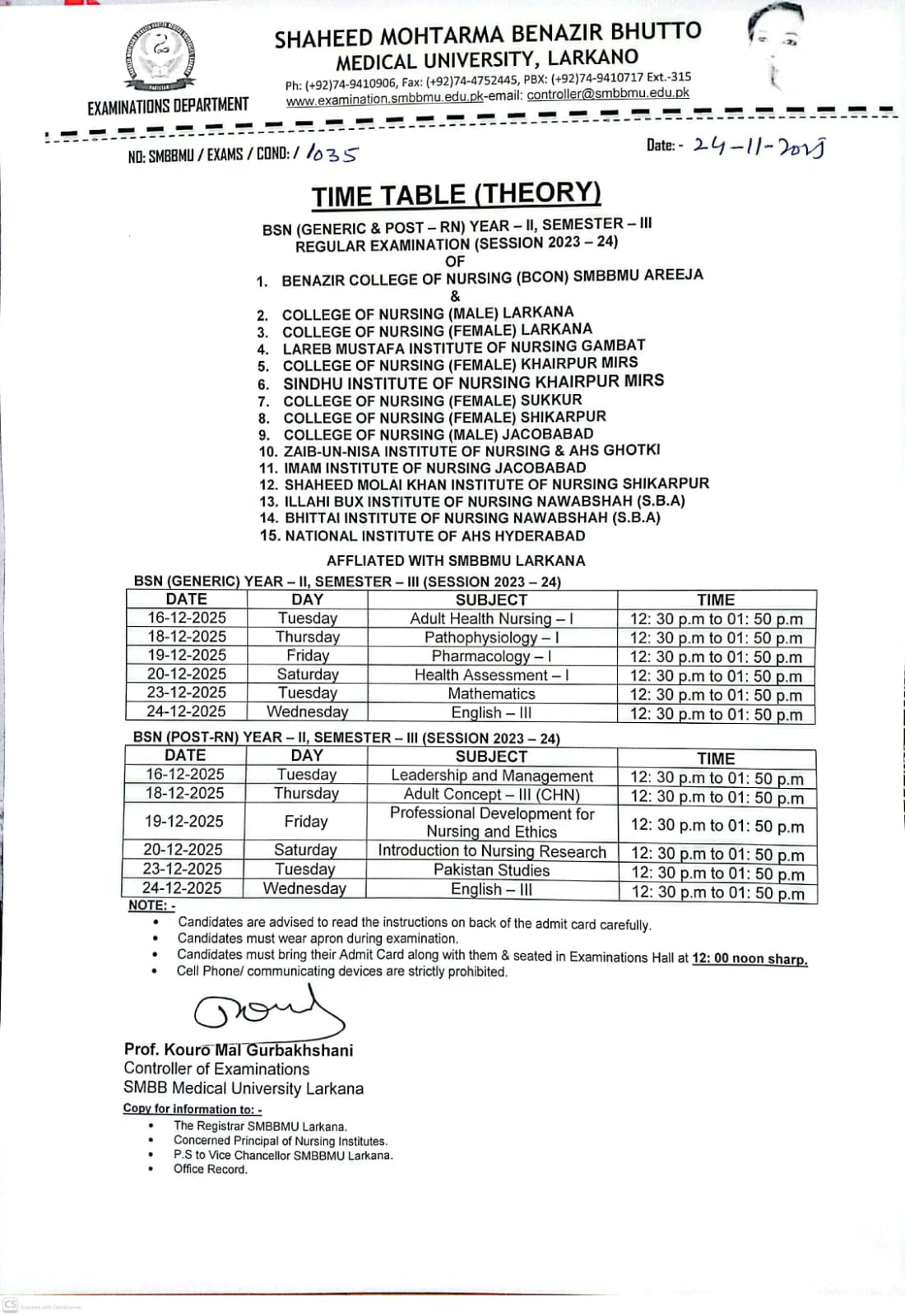 Timetable Theory BSN(Generic & PostRN) Year-II Semester-III Regular Examination (Session 2023-24)