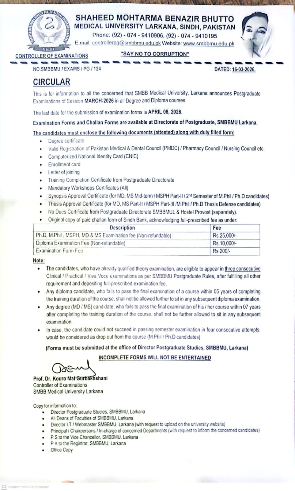 Circular for Postgraduate Examinations of Session March-2026 in all Degree and Diploma courses.
