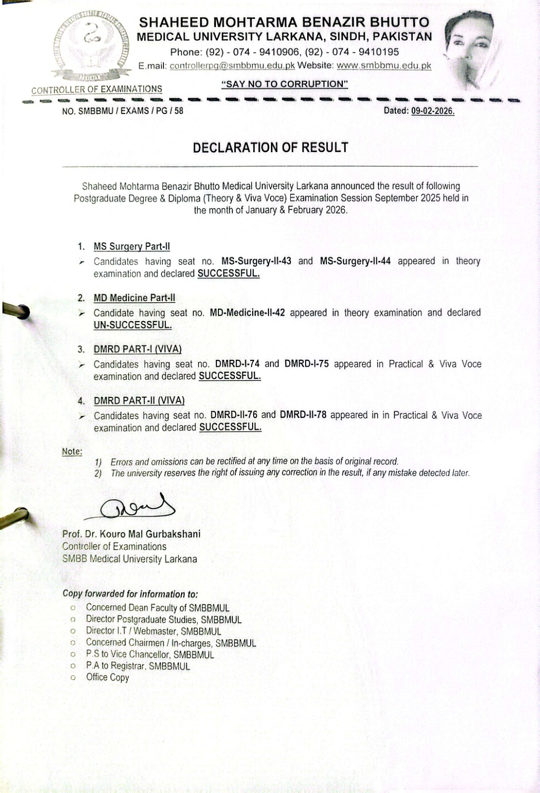 Result of Postgraduate Degree & Diploma (Theory & Viva Voce) Examination Session September 2025 held in the month of January & February 2026.
