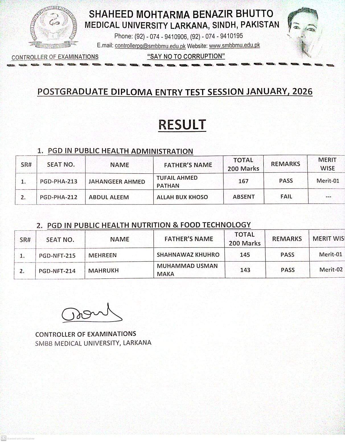 Result of Postgraduate Diploma Entry Test Session January, 2026