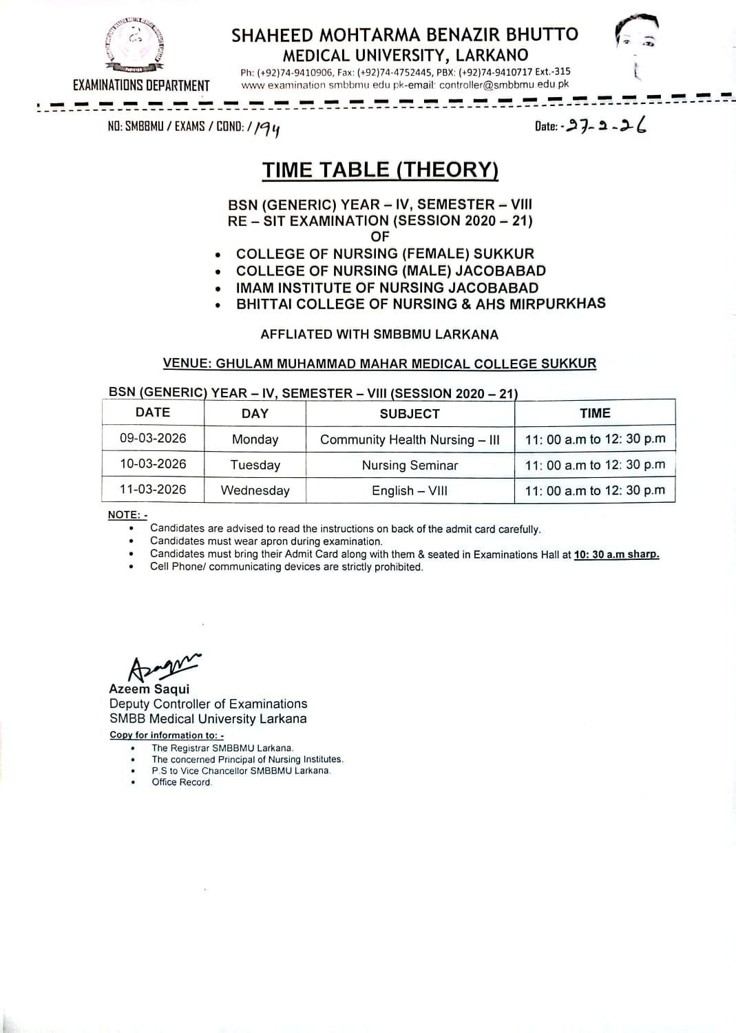 Time Table (Theory) BSN (Generic) Year-IV, Semester- VIII Re-sit Examination (Session 2020 - 21)